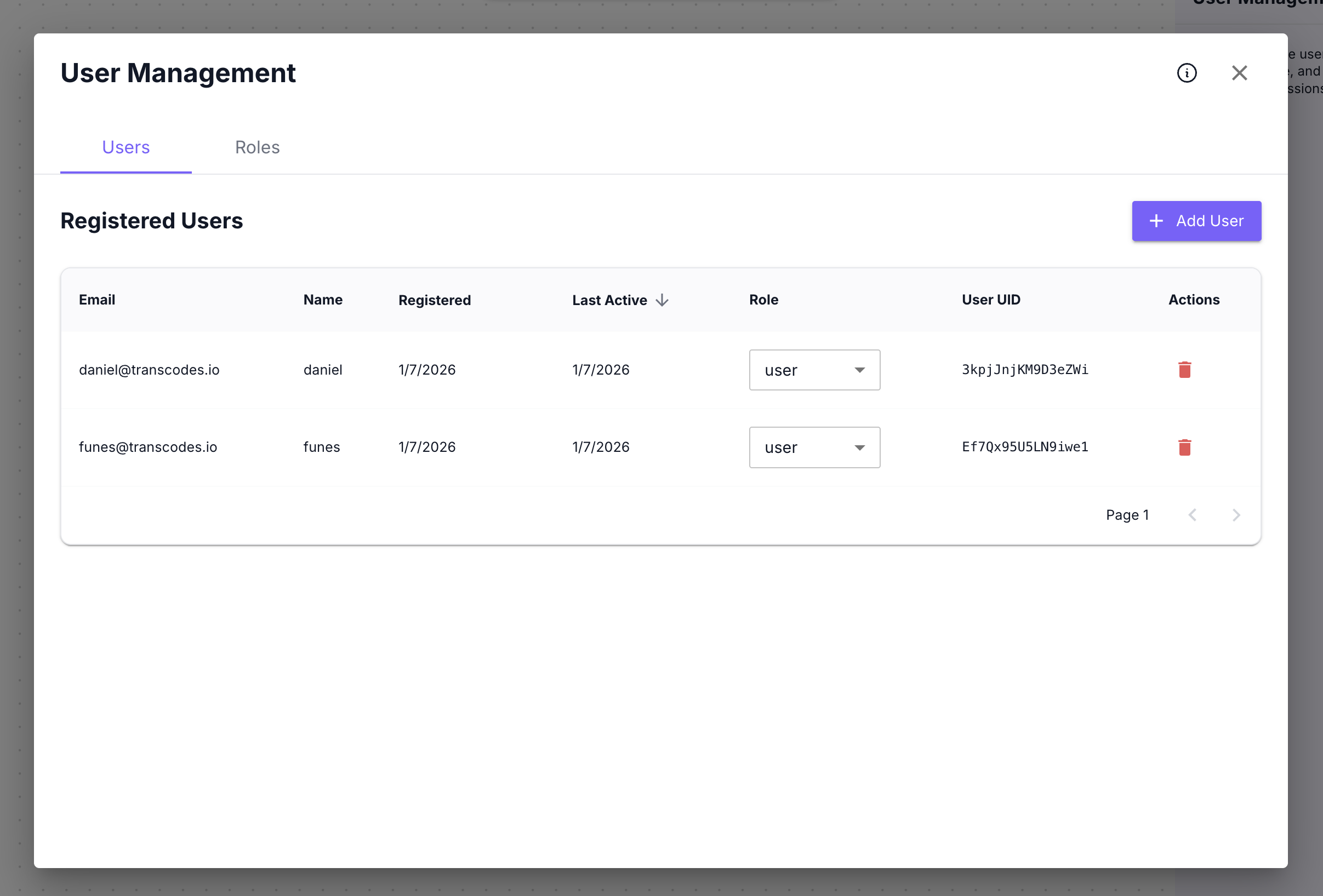 The User Management modal opens in the center with two tabs: Users and Roles.